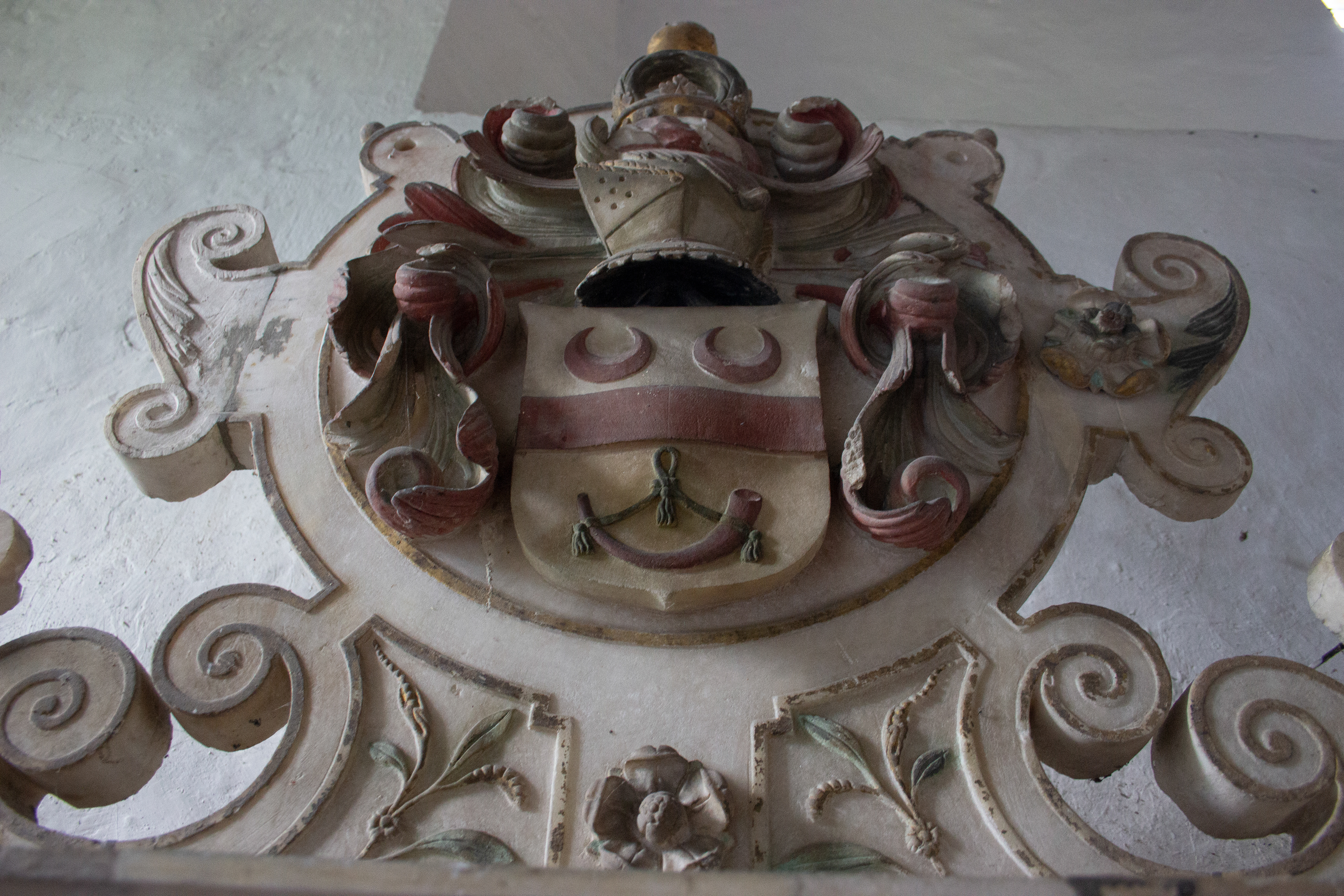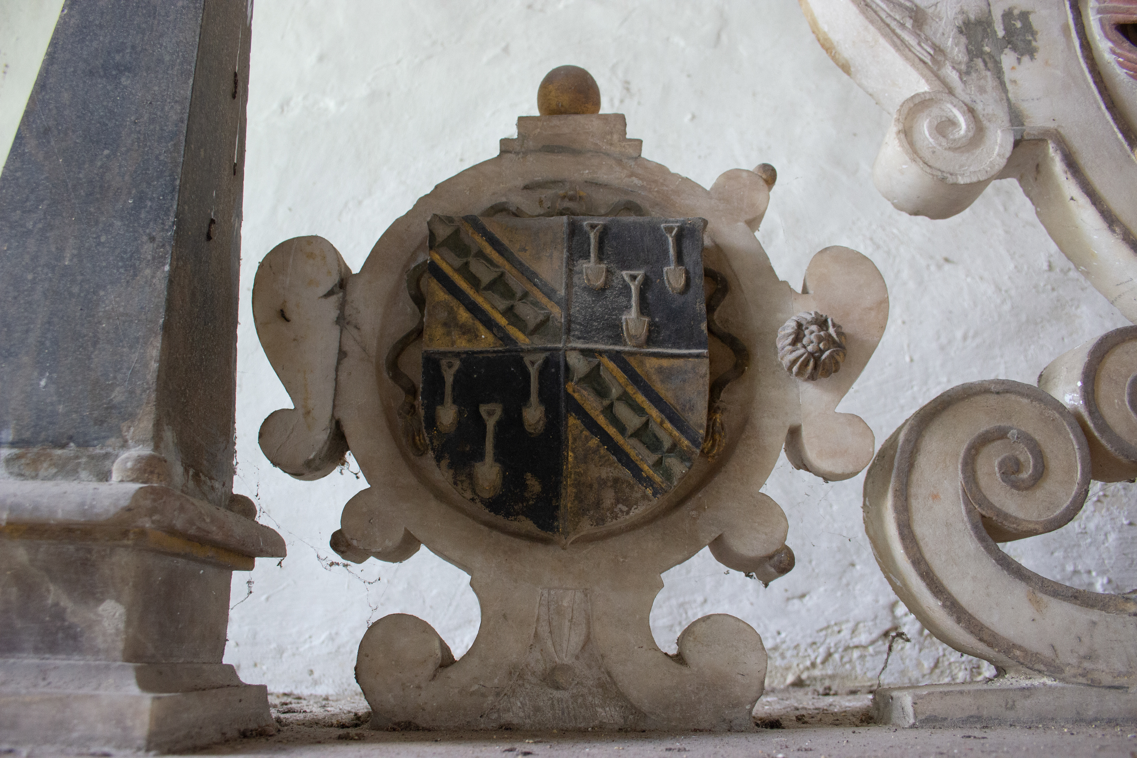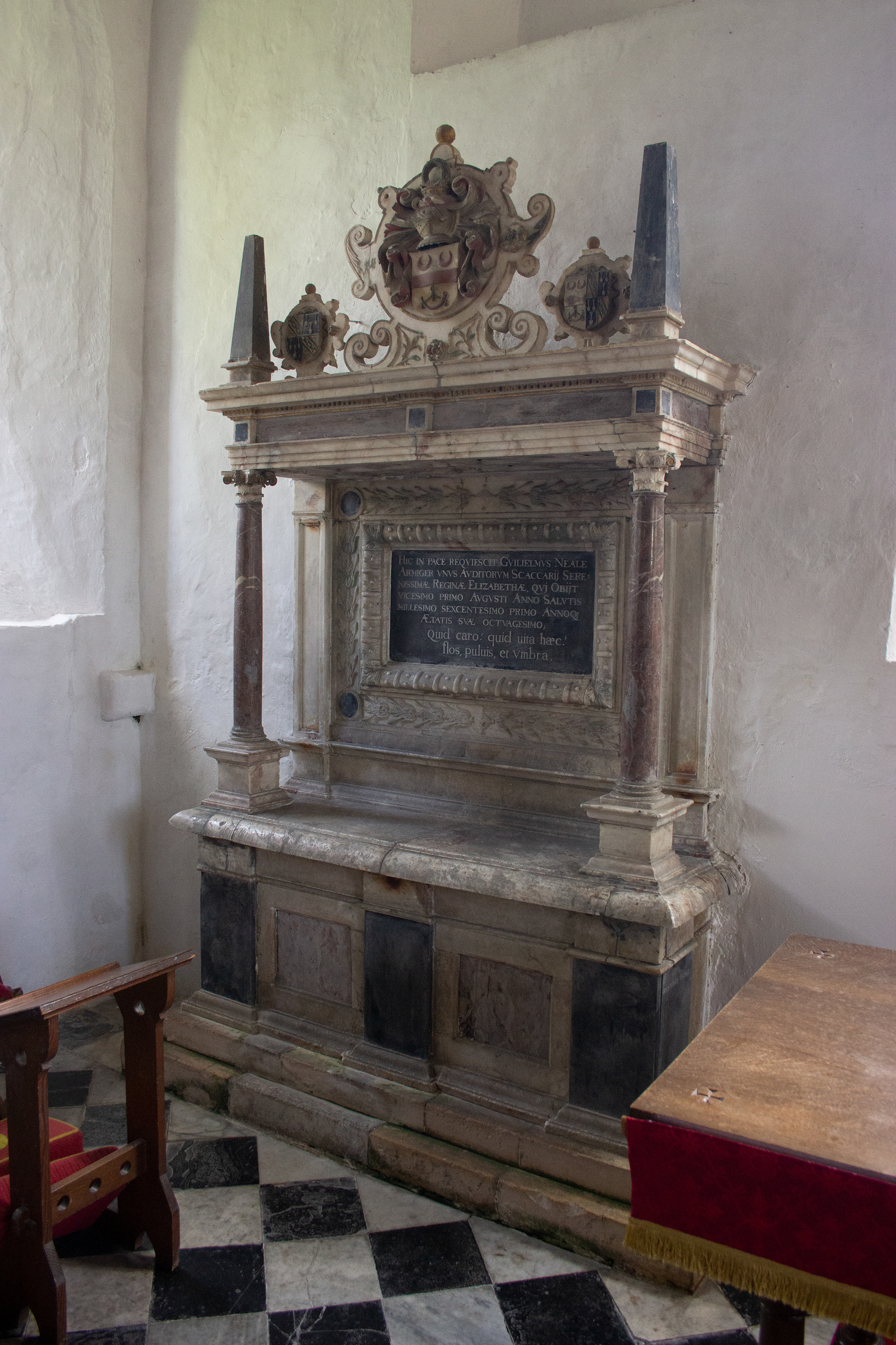 William’s son Sir Thomas Neale, who also served as Auditor of the Exchequer under both Elizabeth I and James I, would succeed to the estate and it is he who is immortalised by an elaborate memorial featuring recumbent effigies of himself between his two wives Elizabeth and Mary underneath an imposing canopy, on which you still see some of the original paint and gilding, as well as their numerous offspring, some of whom were predeceased, depicted along the base of the monument. Remarkably, this particular monument was first restored in the 1920’s by American descendants of the Neale family and upon its second restoration and disassembly in the 1980’s a medieval niche was found behind it, hidden for around 350 years.