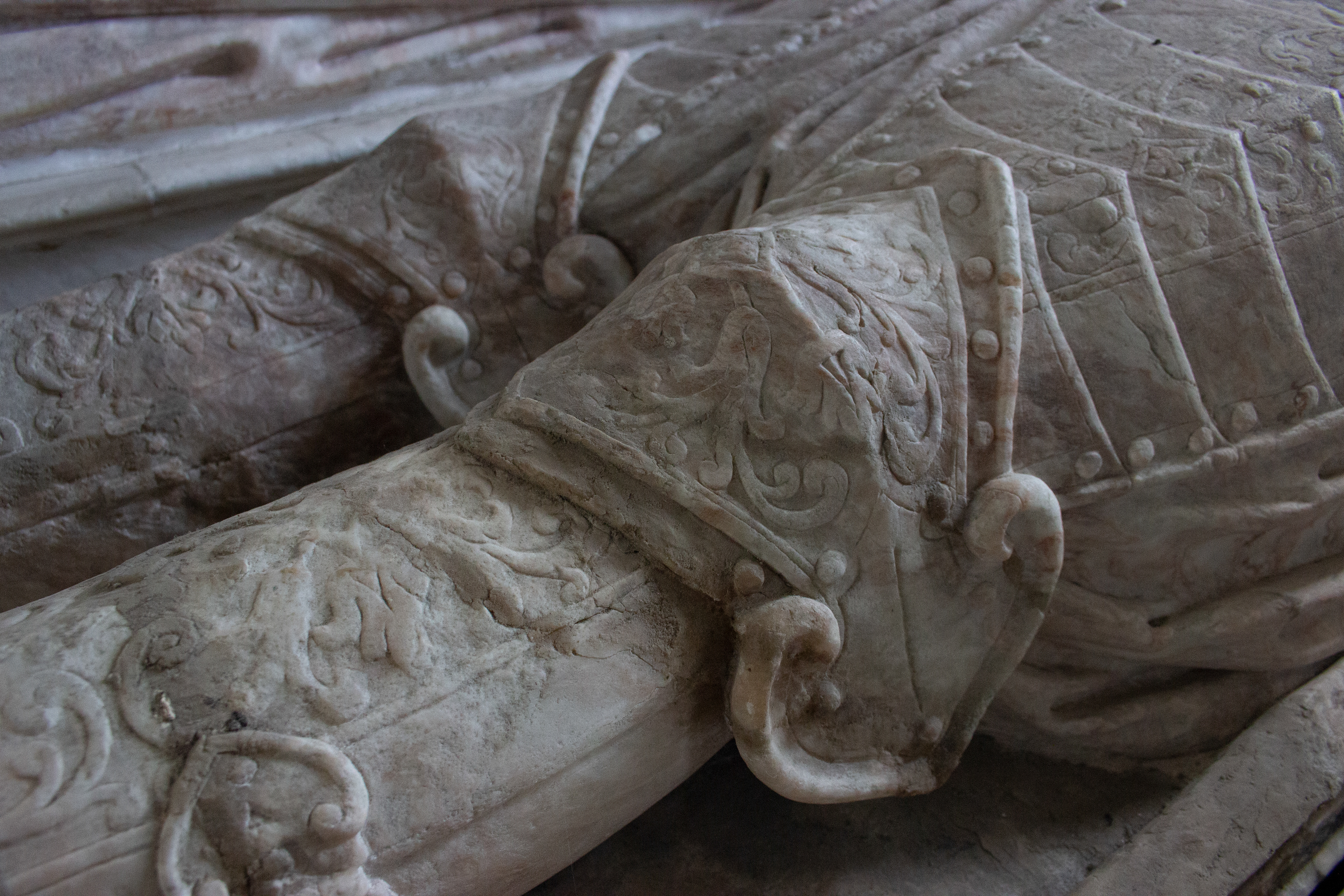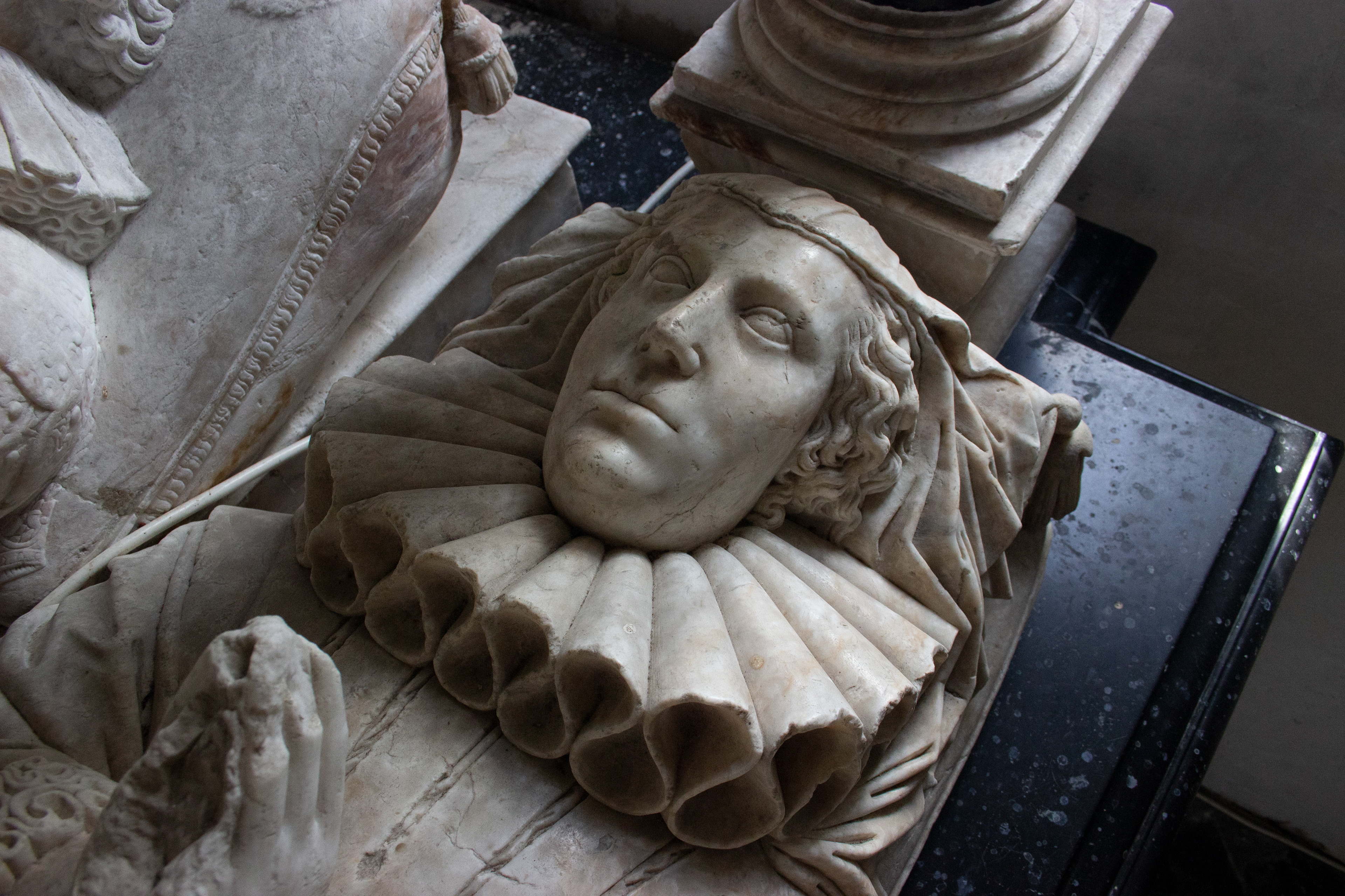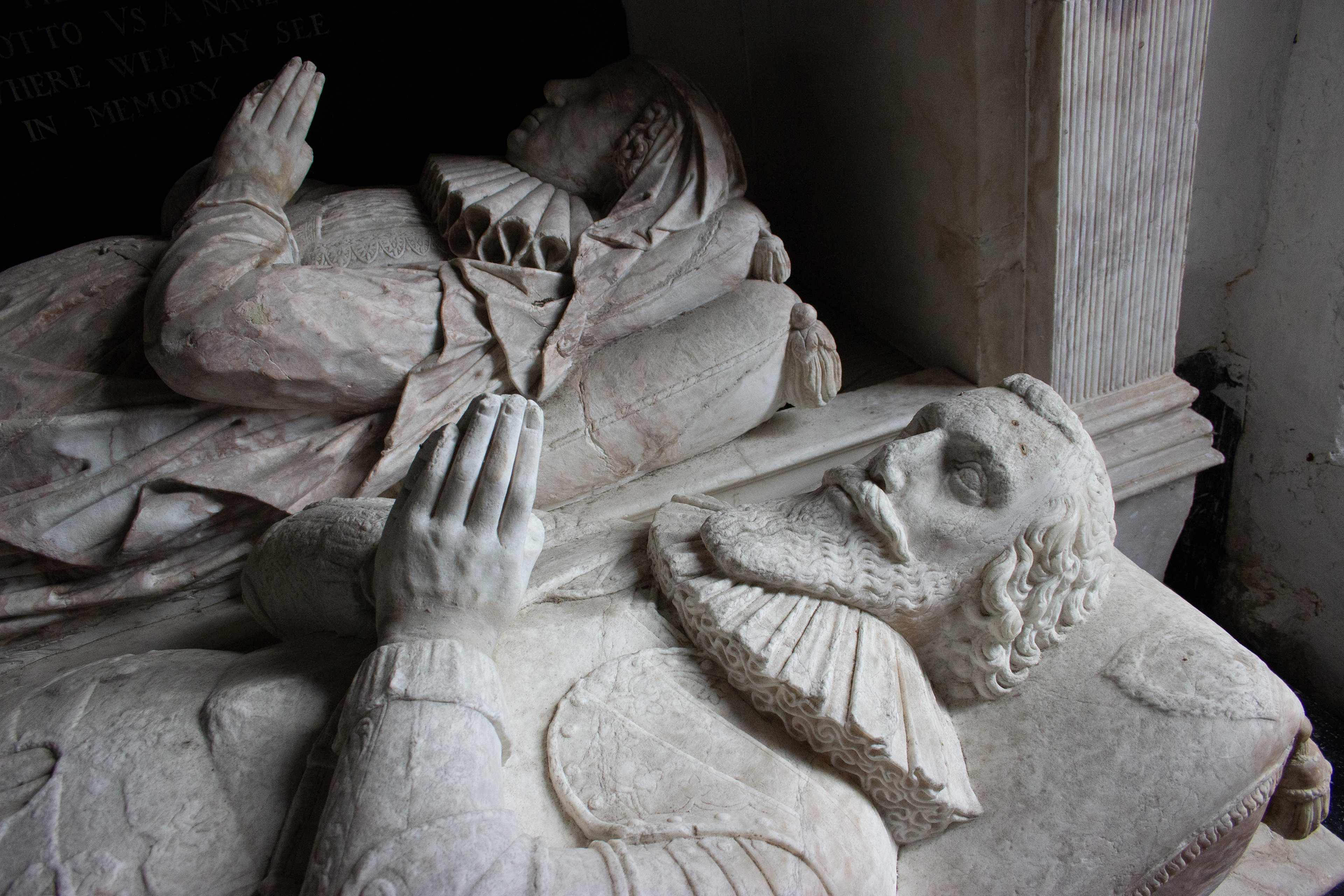 William’s son Sir Thomas Neale, who also served as Auditor of the Exchequer under both Elizabeth I and James I, would succeed to the estate and it is he who is immortalised by an elaborate memorial featuring recumbent effigies of himself between his two wives Elizabeth and Mary underneath an imposing canopy, on which you still see some of the original paint and gilding, as well as their numerous offspring, some of whom were predeceased, depicted along the base of the monument. Remarkably, this particular monument was first restored in the 1920’s by American descendants of the Neale family and upon its second restoration and disassembly in the 1980’s a medieval niche was found behind it, hidden for around 350 years.
