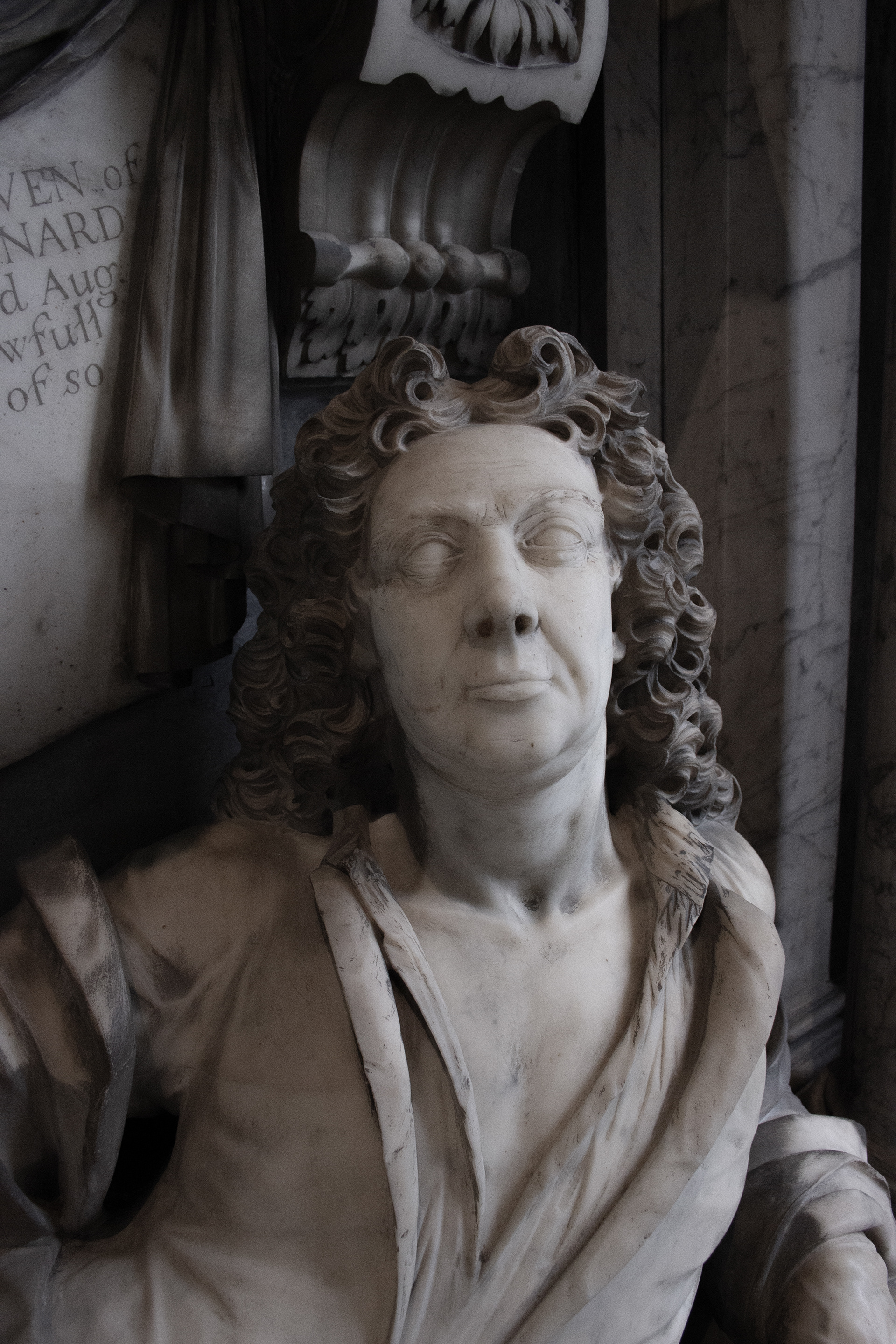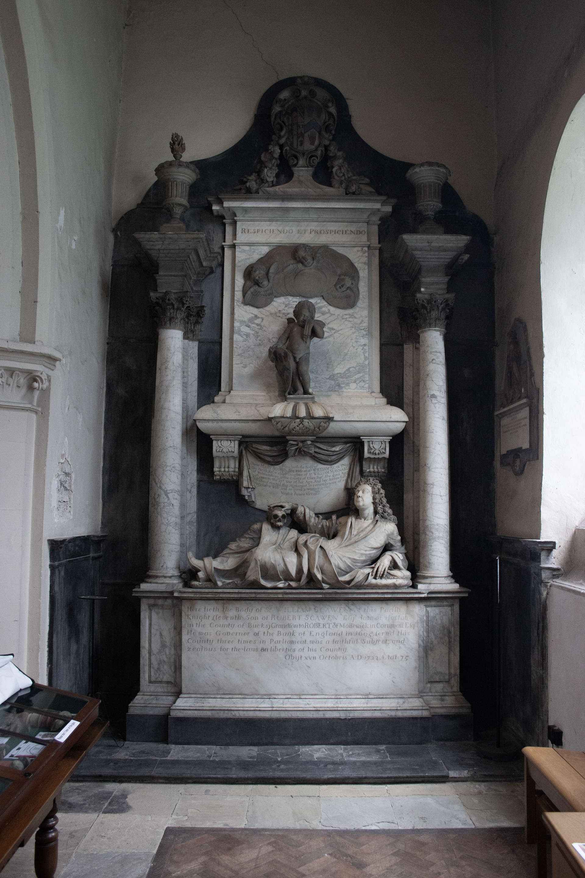 Situated in the south aisle is the grand memorial to a Sir William Scawen, though you would be easily mistaken for their are in fact two separate monuments here with the wall panel directly above Sir William commemorating his wife Dame Mary Scawen née Maynard who predeceased him.